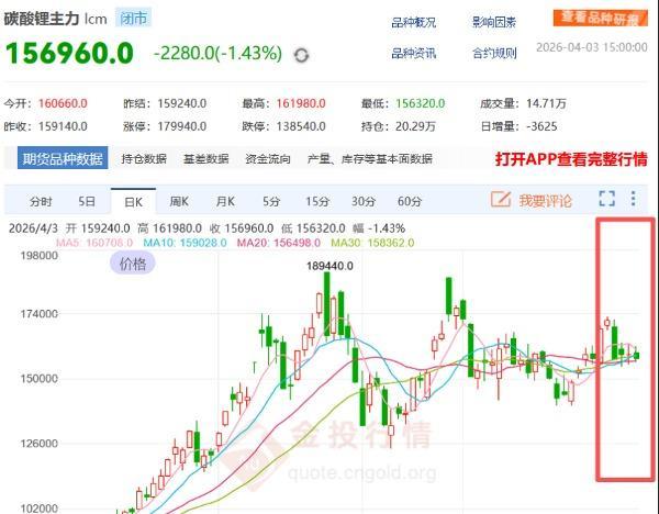 截至4月3日,碳酸锂主力期货合约报156960元/吨(跌幅1.42%),电池级现货报价达158000元/吨,较2025年下半年6–7万元水平已上涨超1.2倍。Mysteel预测,价格将维持在13万–17万元/吨区间波动。
