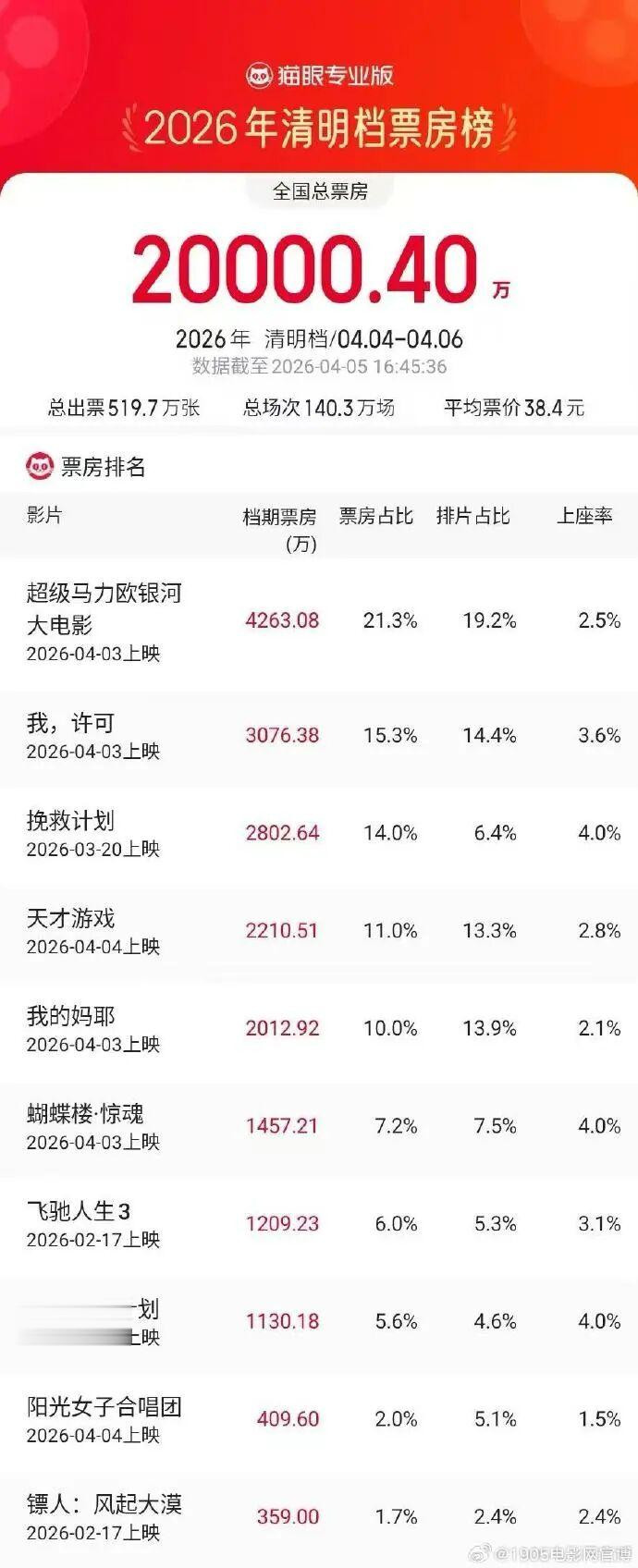 据网络平台数据,截至4月5日,2026年清明档(4月4日-4月6日)总票房破2亿,《超级马力欧银河大电影》《我,许可》《挽救计划》分列清明档票房榜前三位。